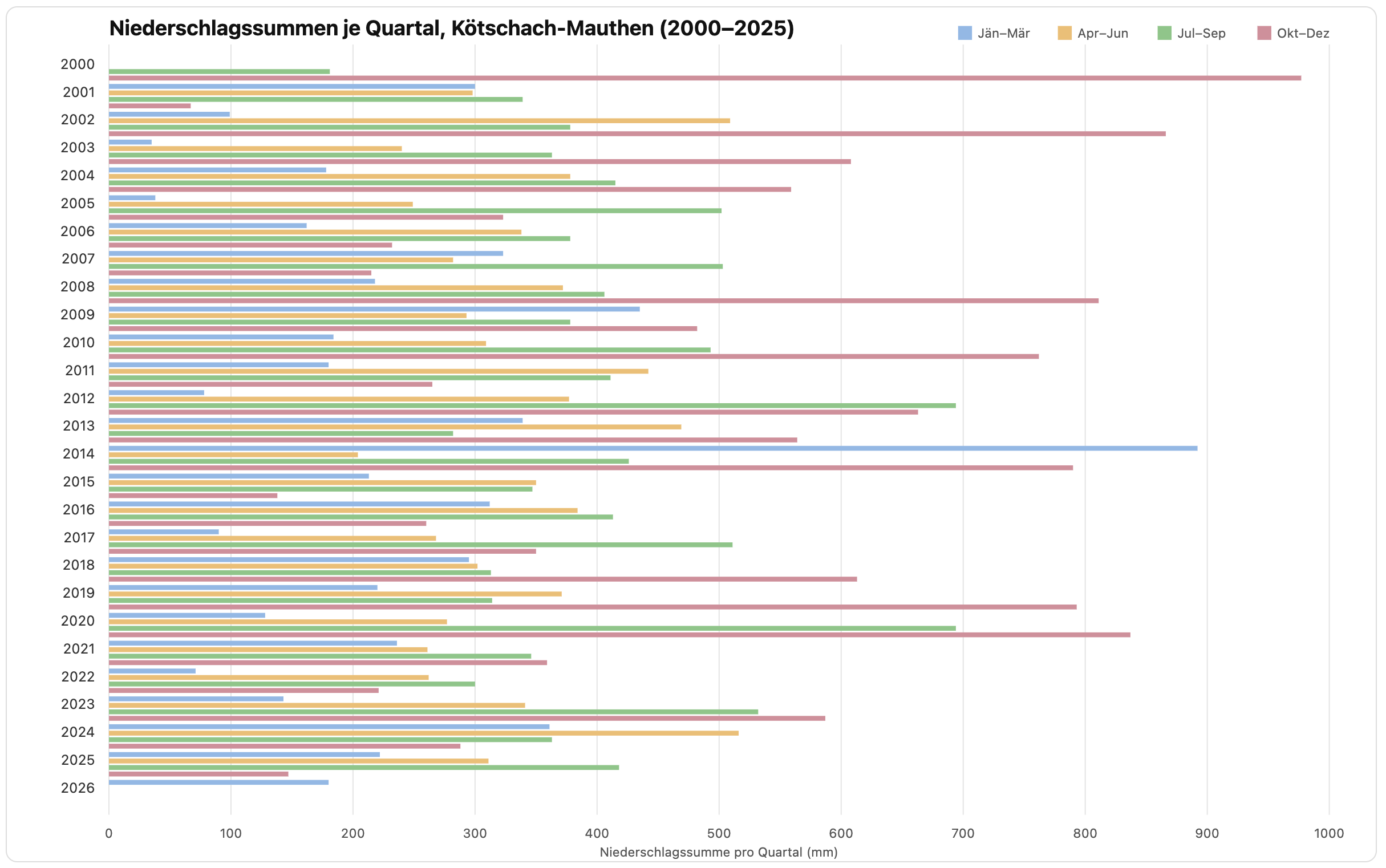 Die Niederschlagsentwicklung an der Wetterstation Kötschach-Mauthen zeigt über die Jahre 2000–2025 ein klares saisonales Muster mit deutlichen Unterschieden zwischen den Quartalen. Im ersten Quartal (Jänner bis März) sind die Niederschlagssummen meist vergleichsweise gering. Das hängt mit der winterlichen Großwetterlage zusammen: Niederschlag fällt häufig als Schnee und die absoluten Wassermengen bleiben moderat. Dennoch treten einzelne Jahre mit erhöhten Werten auf, insbesondere bei milderen Wintern.